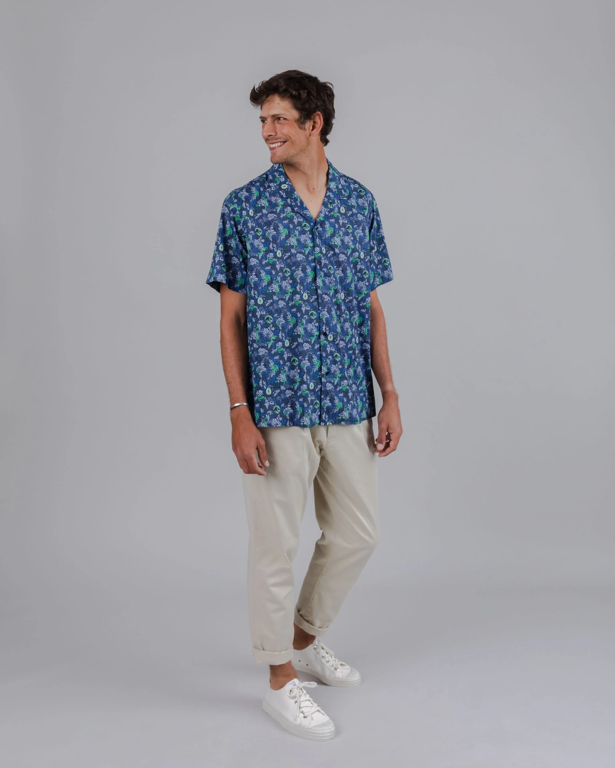 Relaxed fit short sleeve aloha shirt with a Jurassic Park print. It features a slightly dropped shoulder, straight hem, camp collar, and button closure. Ethically made from organic cotton.