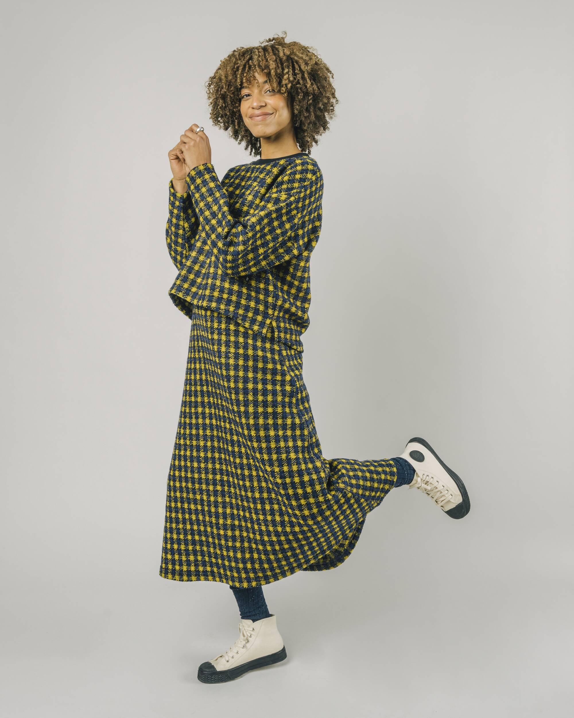 There is a 100% chance of staying warm and cozy all winter long in this comfy skirt made of recycled polyester and wool in a cheerful color combo.