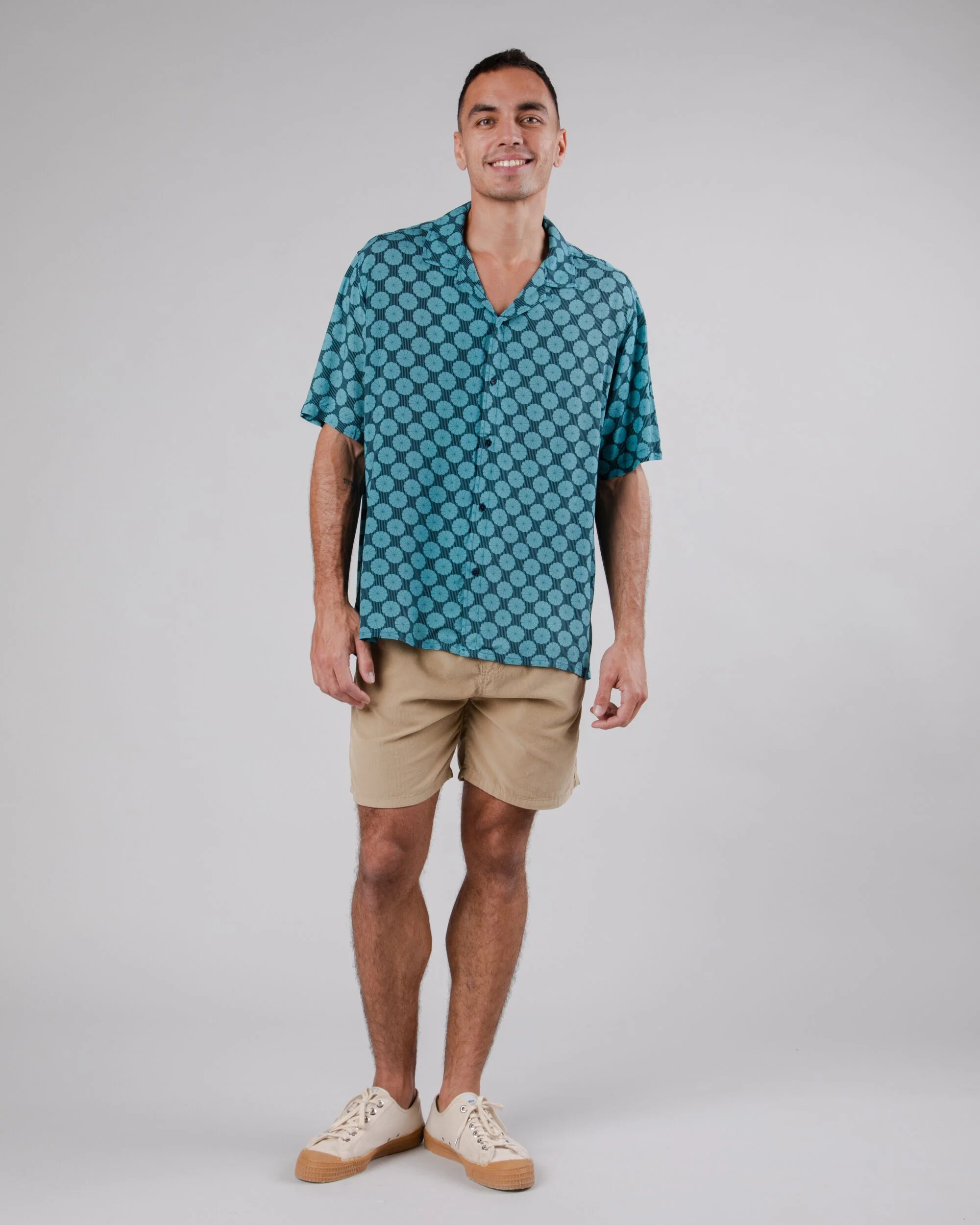 Relaxed fit short sleeve aloha shirt with a "sunshade" print. It features a slightly dropped shoulder, straight hem, camp collar, and button closure. Ethically made from sustainable viscose.