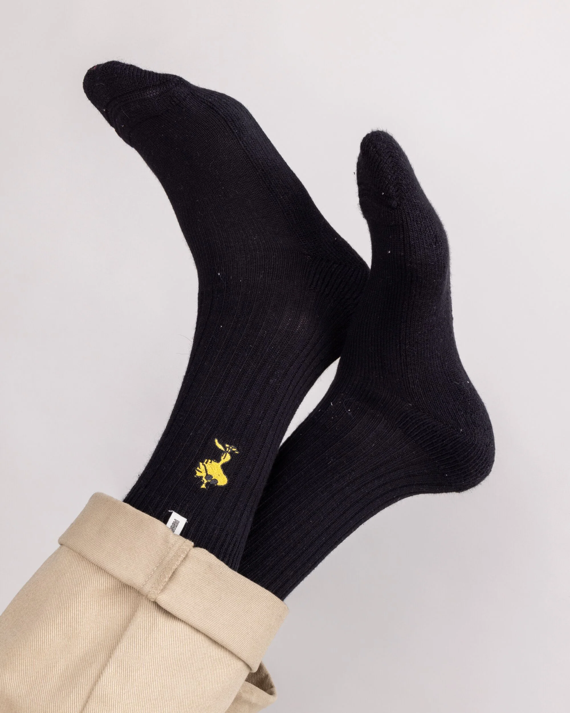Peanuts cotton socks with a mid-calf length, medium thickness, embroidered with an illustration of Woodstock. Ethically made from organic cotton, polyamide and elastane.