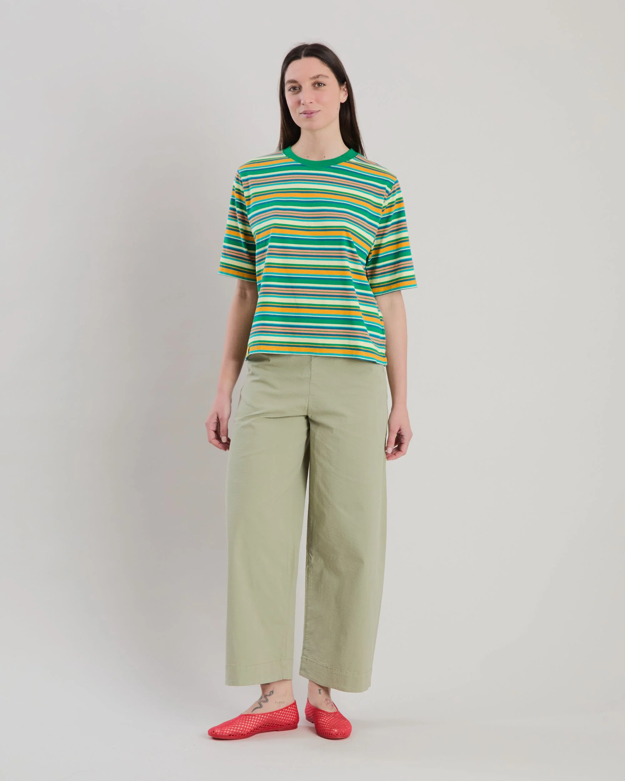 Cropped fit straight leg high-rise long pants with an elastic waistband and front pockets. Ethically made from organic cotton and elastane.
