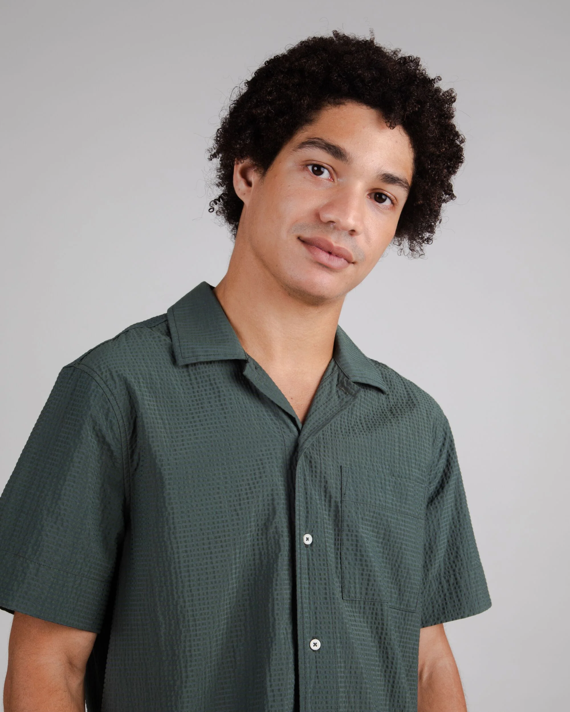 Relaxed-fit short sleeve aloha overshirt. It features a slightly dropped shoulder, straight hem, camp collar, and button closure. Made out of seersucker, a lightweight fabric. Ethically made from organic cotton, recycled poliamide and poliamide.